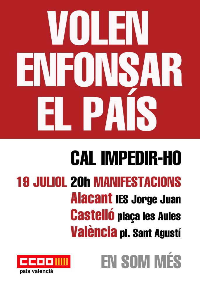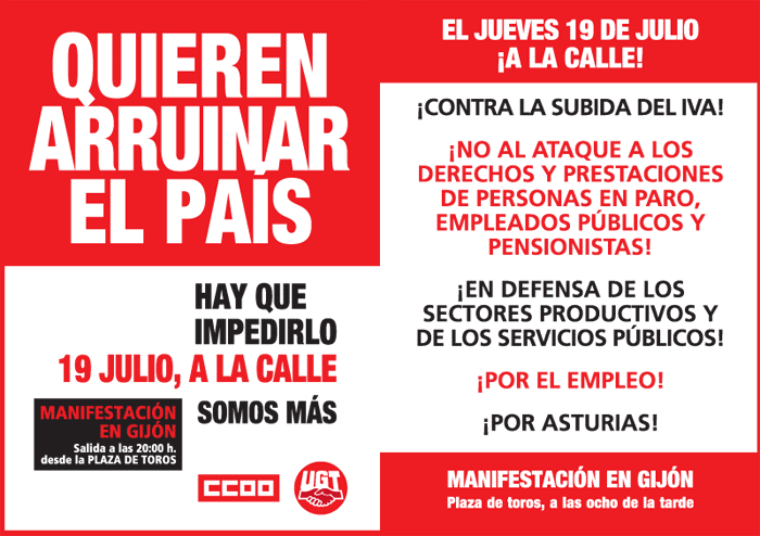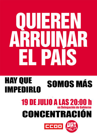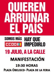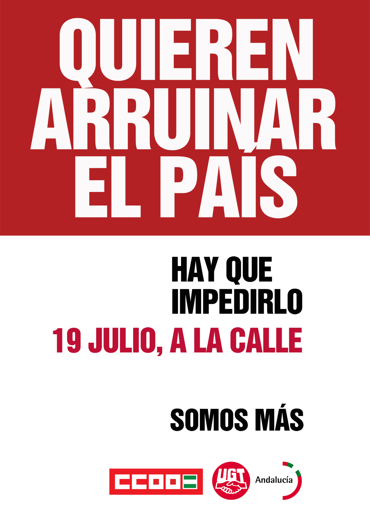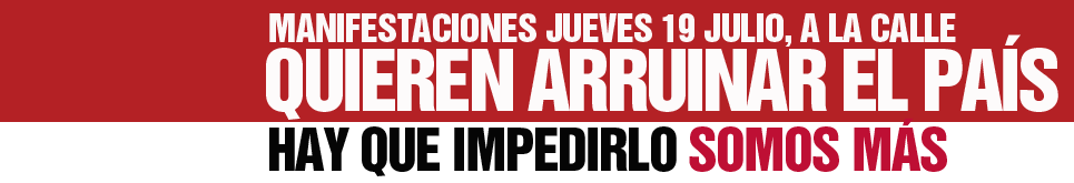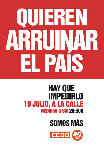 CCOO y UGT invitan a todos los trabajadores y trabajadoras, así como a colectivos y asociaciones de la sociedad civil, a participar en las manifestaciones que se convocarán en todo el país para el próximo 19 de julio contra los nuevos recortes anunciados por el presidente del Gobierno, que afectan a las personas en paro, a los empleados públicos, a los pensionistas y que generan más desempleo y recesión económica.