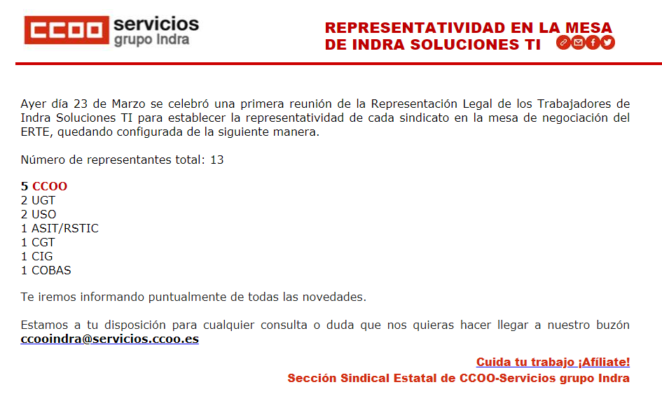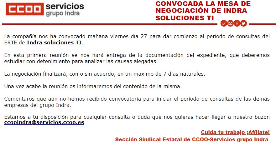 Todas las medidas que hemos propuesto son similares a las que estamos proponiendo en todos los ERTE que CCOO está negociando. Es importante destacar que las medidas acordadas en Indra en el caso de un eventual acuerdo, marcarán no solo la senda de las medidas en el resto del grupo sino también en el sector y en el país.