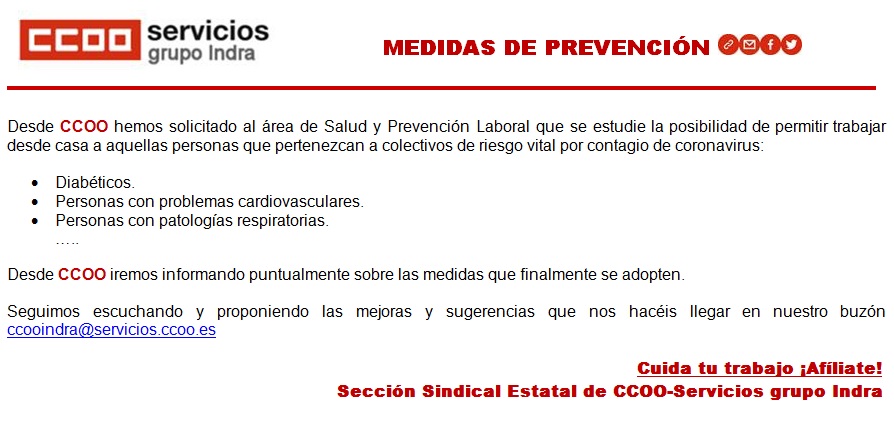 Seguimos escuchando y proponiendo las mejoras y sugerencias que nos hacéis llegar en nuestro buzón ccooindra@servicios.ccoo.es