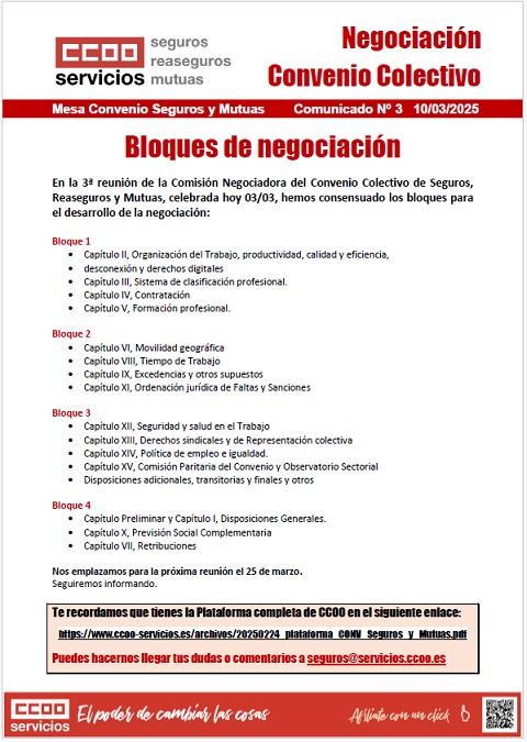 En la 3ª reunión de la Comisión Negociadora del Convenio Colectivo de Seguros, Reaseguros y Mutuas, celebrada el 10/03, hemos consensuado los bloques para el desarrollo de la negociación.