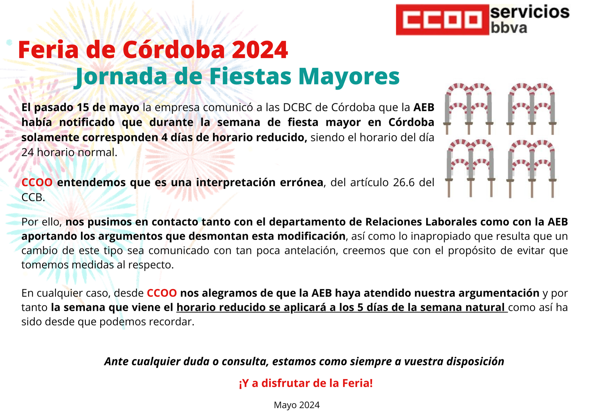 El pasado 15 de mayo la empresa comunicó a las DCBC de Córdoba que la AEB había notificado que durante la semana de fiesta mayor en Córdoba solamente corresponden 4 días de horario reducido, siendo el horario del día 24 horario normal.