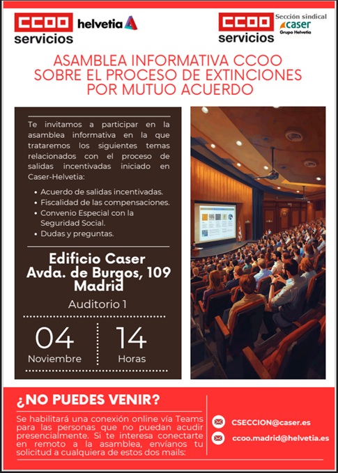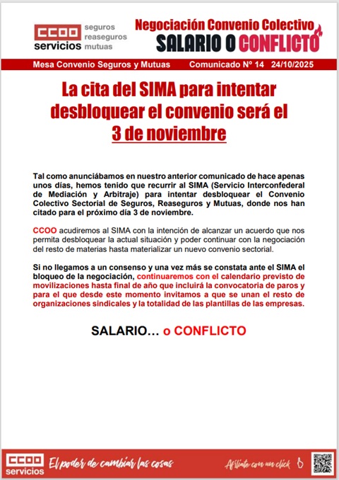 El conflicto laboral en el sector de Seguros y Mutuas se agudiza. CCOO Servicios ha convocado el 6 de noviembre una concentración ante la sede en Madrid de la patronal de Seguros (UNESPA) por el bloqueo del convenio.