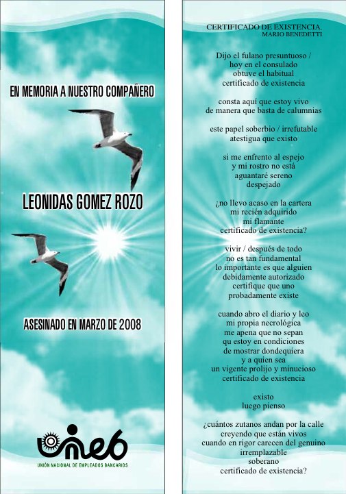 En memoria de nuestro compañero Leónidas Gómez Rozo, asesinado el 8 de marzo de 2008