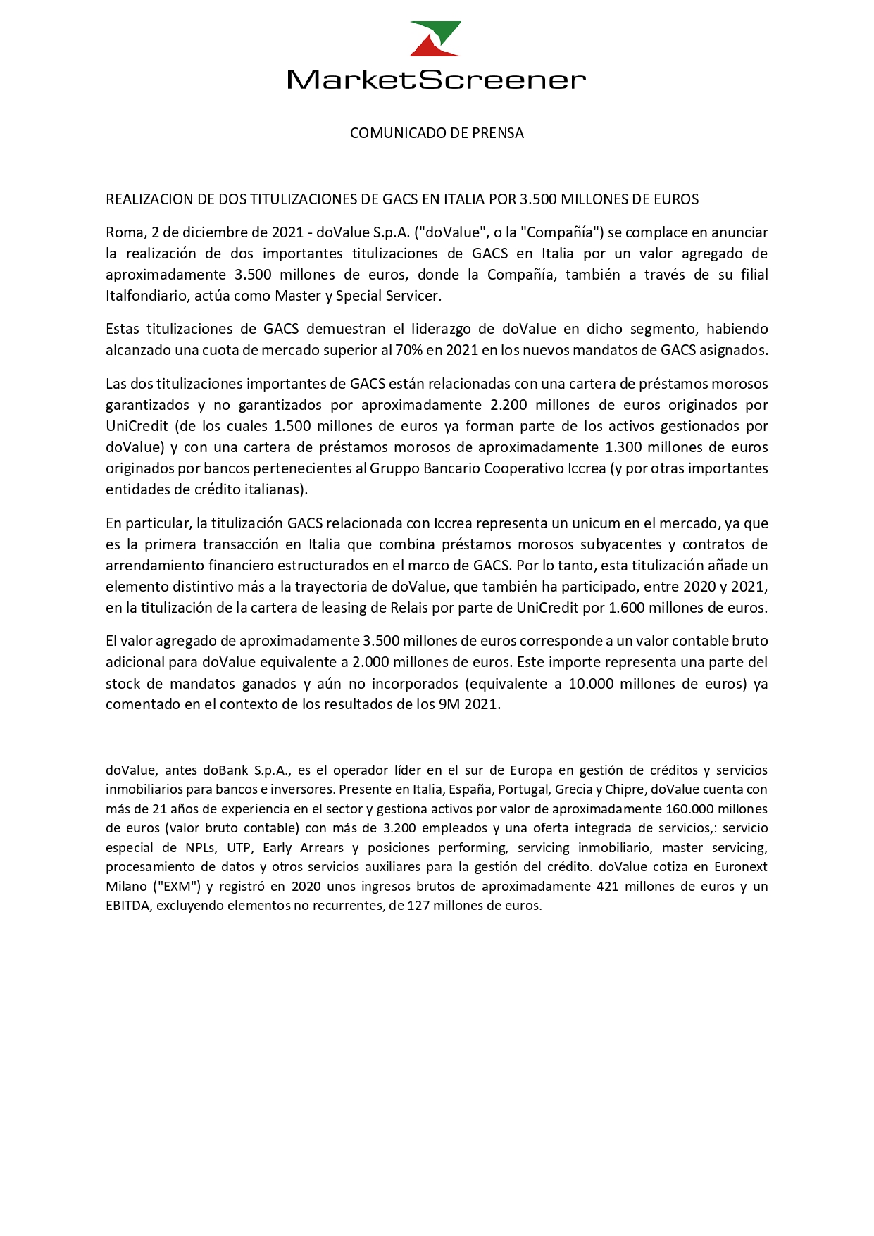 Nota de Prensa Sareb – doValue SpA comunica que Sareb (la sociedad creada por el Gobierno español y la Banca española en 2012 con el objetivo de gestionar y desinvertir activos en dificultades que le fueron transferidos desde cuatro entidades financieras nacionalizadas españolas) no ha adjudicado un nuevo contrato a doValue (el contrato actual vence en junio de 2022).