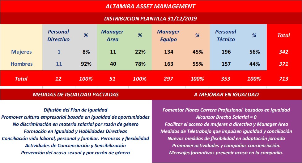 En Altamira disponemos de Plan de Igualdad y Protocolo para la Prevención del acoso laboral y el acoso sexual cuya vigencia se ha prorrogado un año más, con nuevo vencimiento en Diciembre de 2021, fecha para la que deberán ser adaptados a las nuevas medidas publicadas y desarrolladas en los nuevos reglamentos sobre igualdad retributiva y planes de igualdad.