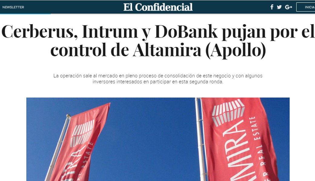 Cerberus sube la apuesta por el mercado inmobiliario español. El fondo estadounidense se presenta como el candidato favorito para hacerse con las riendas de Altamira, la gestora del crédito promotor y de activos inmobiliarios adjudicados actualmente en manos de Apollo y Santander. Además, Cerberus se disputa la compra de Solvia con el fondo Lindorff (ahora Intrum) y otros inversores.