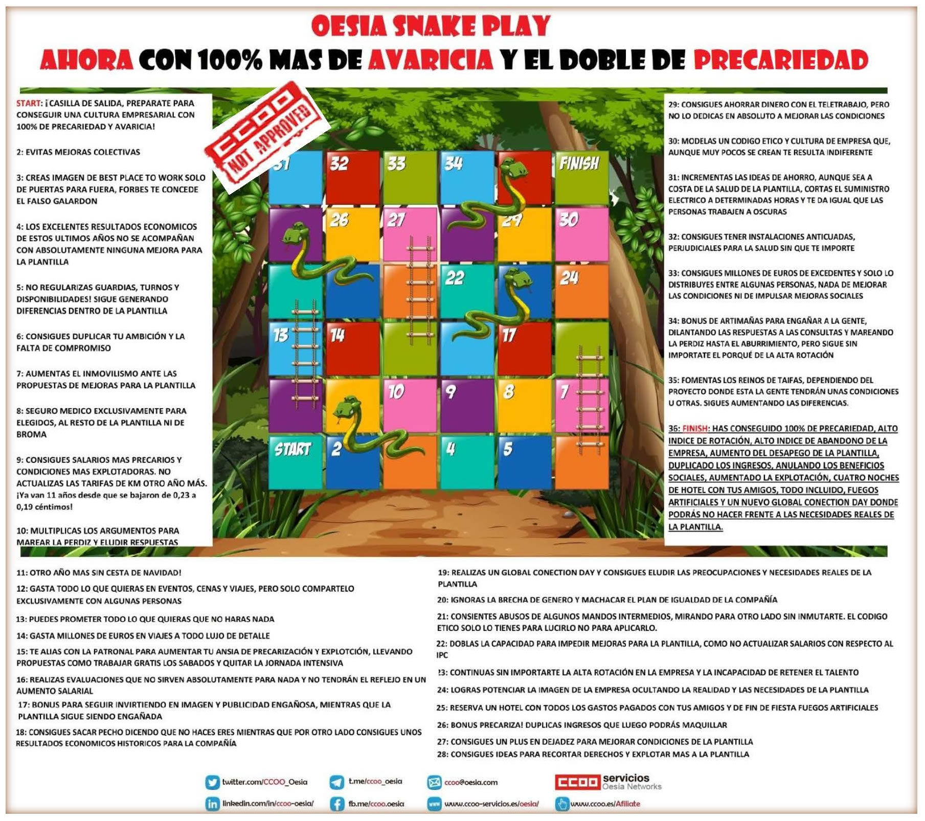 Prepárate para conseguir una cultura empresarial con 100% de precariedad y avaricia. Oesía consigue un alto índice de rotación, alto índice de abandono de la empresa, aumento del desapego de la plantilla. Oesía ha duplicado ingresos, anulando los beneficios sociales, aumentando la explotación. Eso sí, cuatro noches de hotel con tus amigos, todo incluido, fuegos artificiales y un nuevo Global Connection Day donde podrás… NO hacer frente las necesidades reales de la plantilla.