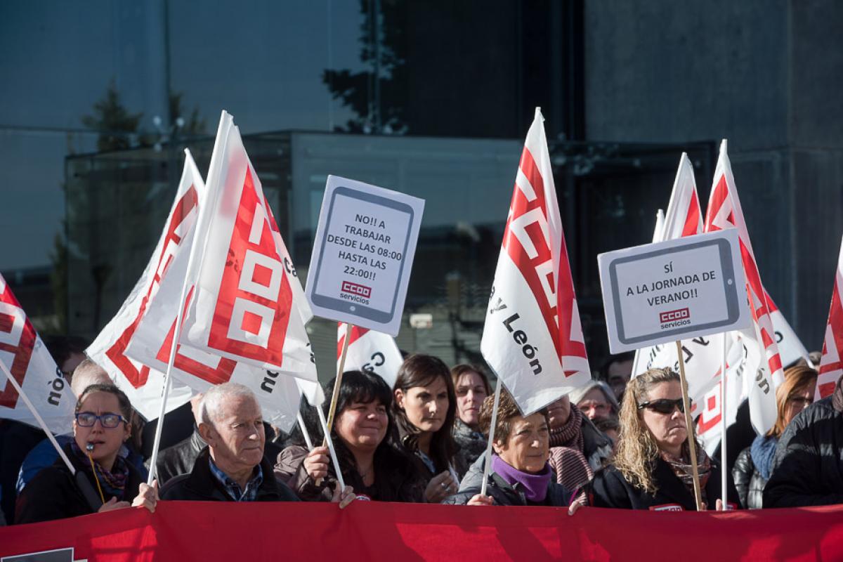 Durante la concentración numerosas personas portaban pancartas con las siguientes consignas: 'No a trabajar desde las 8:00 hasta las 22:00 horas'; 'No a la precariedad laboral'; 'No a la absorción de la antigüedad'; 'Patronal del convenio: esclavizadores'; 'No a las 1.800 horas anuales'; 'Sí a la jornada de verano'…'