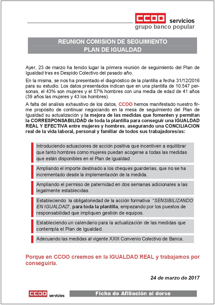 Ayer, 23 de marzo de 2017, ha tenido lugar la primera reunión de la comisión de seguimiento del Plan de Igualdad para el Grupo Banco Popular, tras el proceso del Expediente de Despido Colectivo. En ella CCOO hemos manifestado nuestro firme propósito de continuar negociando su actualización y mejora de las medidas existentes.