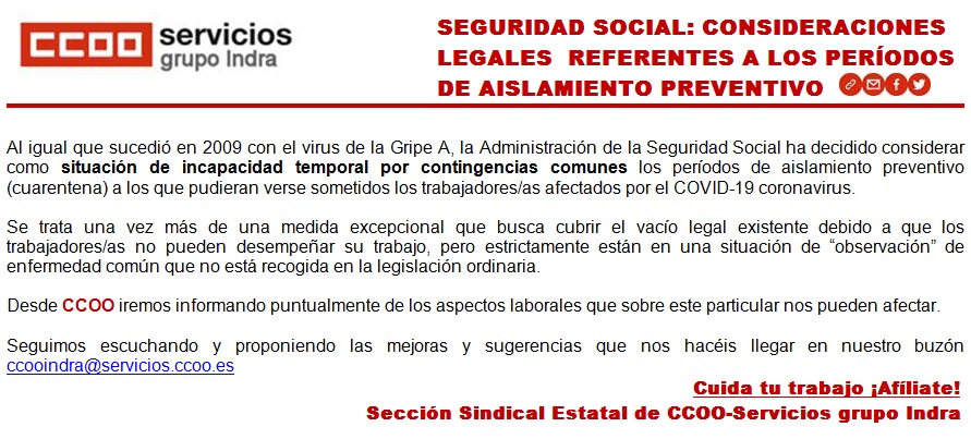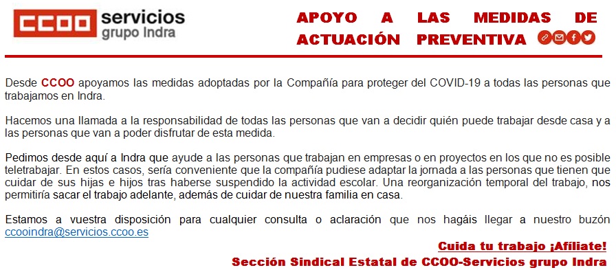 Para cualquier consulta o sugerencia nos podéis contactar escribiendo al buzón ccooindra@servicios.ccoo.es