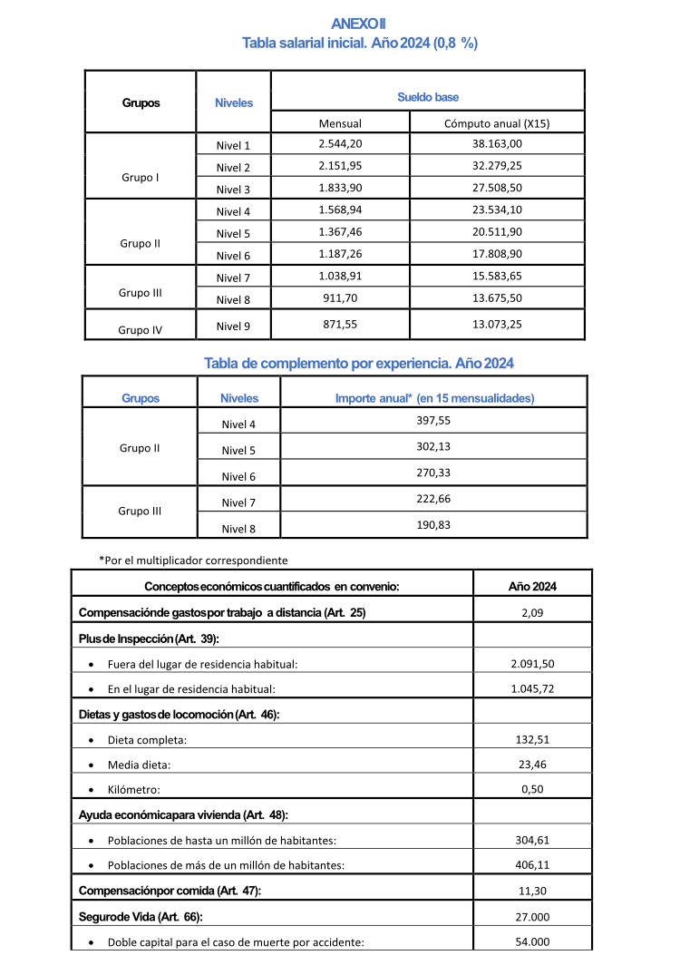 - ANEXO II: La Tabla salarial inicial. Año 2024, que comprende las tablas y conceptos salariales resultantes de aplicar un incremento salarial inicial del 0,8%, con efecto de 1 de enero de 2024, sobre las tablas salariales definitivas de 2023.