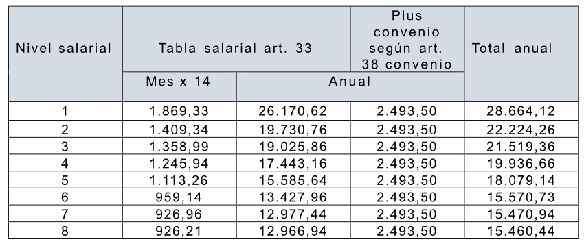 Esta tabla salarial tiene vigencia desde el 1 de enero de 2024, por lo que las empresas están obligadas a actualizarlas y abonar los corrientes atrasos si corresponde. Así mismo, como con posterioridad al acuerdo el Gobierno fijo un nuevo importe del Salario Mínimo Interprofesional también tienen la obligación de repercutir el mismo para los niveles 7 y 8 del Convenio Colectivo.