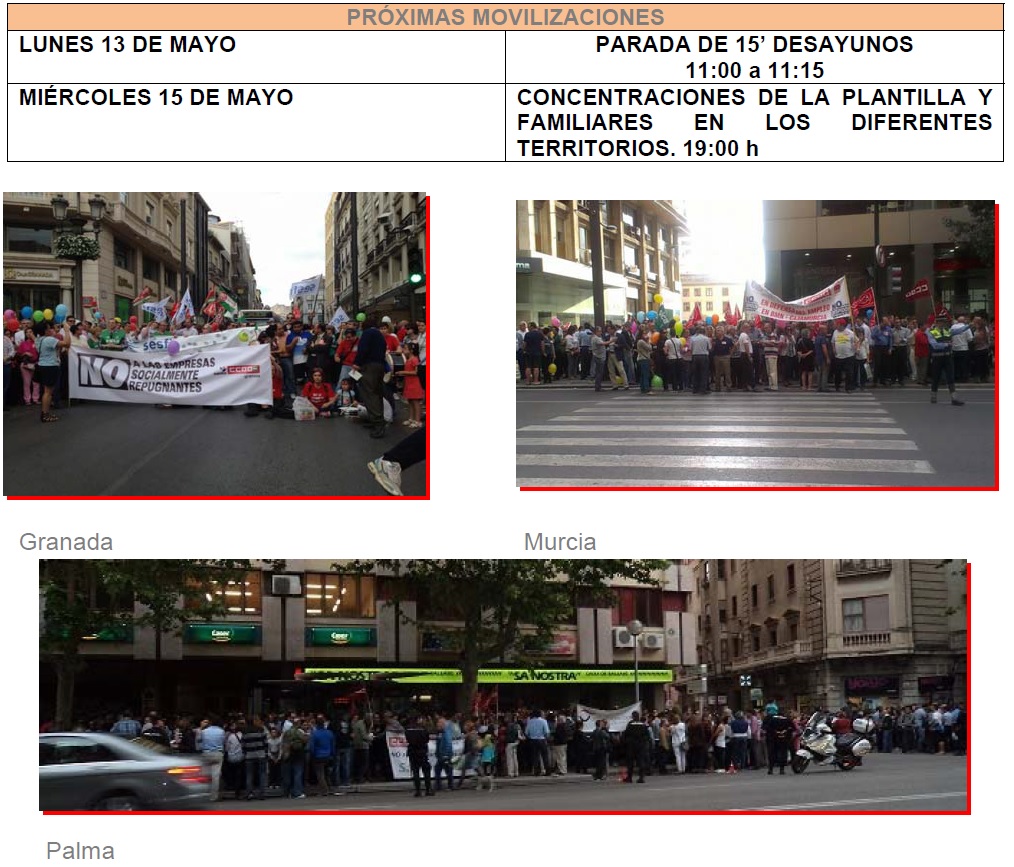 COMFIA-CCOO, con otros sindicatos, realizará una próxima acción el lunes 13 de mayo, de 11 a 11:15 de la mañana, ante la sede de BMN de Vilafranca del Penedès para pedir un cambio de actitud ante la propuesta de la dirección de la entidad de aplicar un ERO para despedir entre 1.035 y 1.050 personas y rebajar radicalmente las condiciones de trabajo de los trabajadores que continuaran en la entidad.