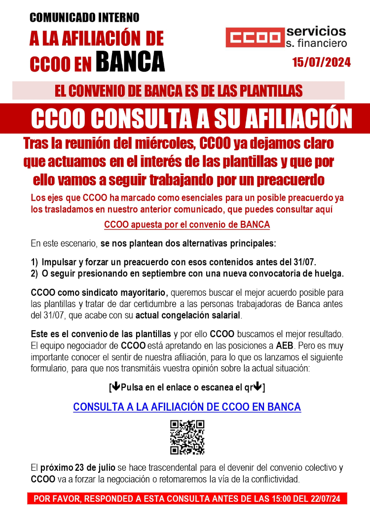 CCOO, desde nuestra responsabilidad como sindicato mayoritario, apostamos por buscar un preacuerdo antes del 31/07, para que las plantillas de Banca dejen de sufrir la actual congelación salarial, mientras las de Ahorro y Rurales ya tienen convenio, gracias a la actuación conjunta de CCOO, UGT y FINE.