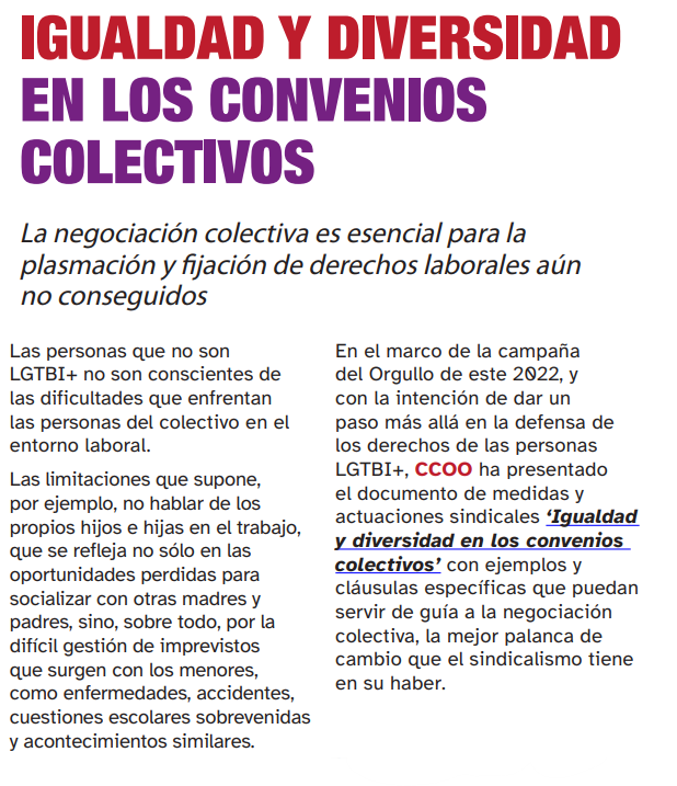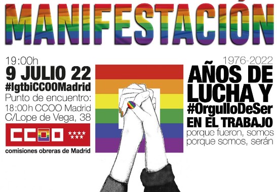 Somos conscientes de todo el camino que queda por recorrer erradicar la LGTBIfobia de nuestra sociedad y nuestros entornos laborales, para que nadie sufra acoso a causa de su orientación sexual y/o identidad o expresión de género y diversidad sexogenérica, con el objetivo de que todas las personas se sientan libres y puedan visibilizarse si así lo desean. En el preacuerdo de nuestro nuevo convenio hay avances en igualdad e inclusión en ese sentido. El 9 de julio será la manifestación en el centro de Madrid.