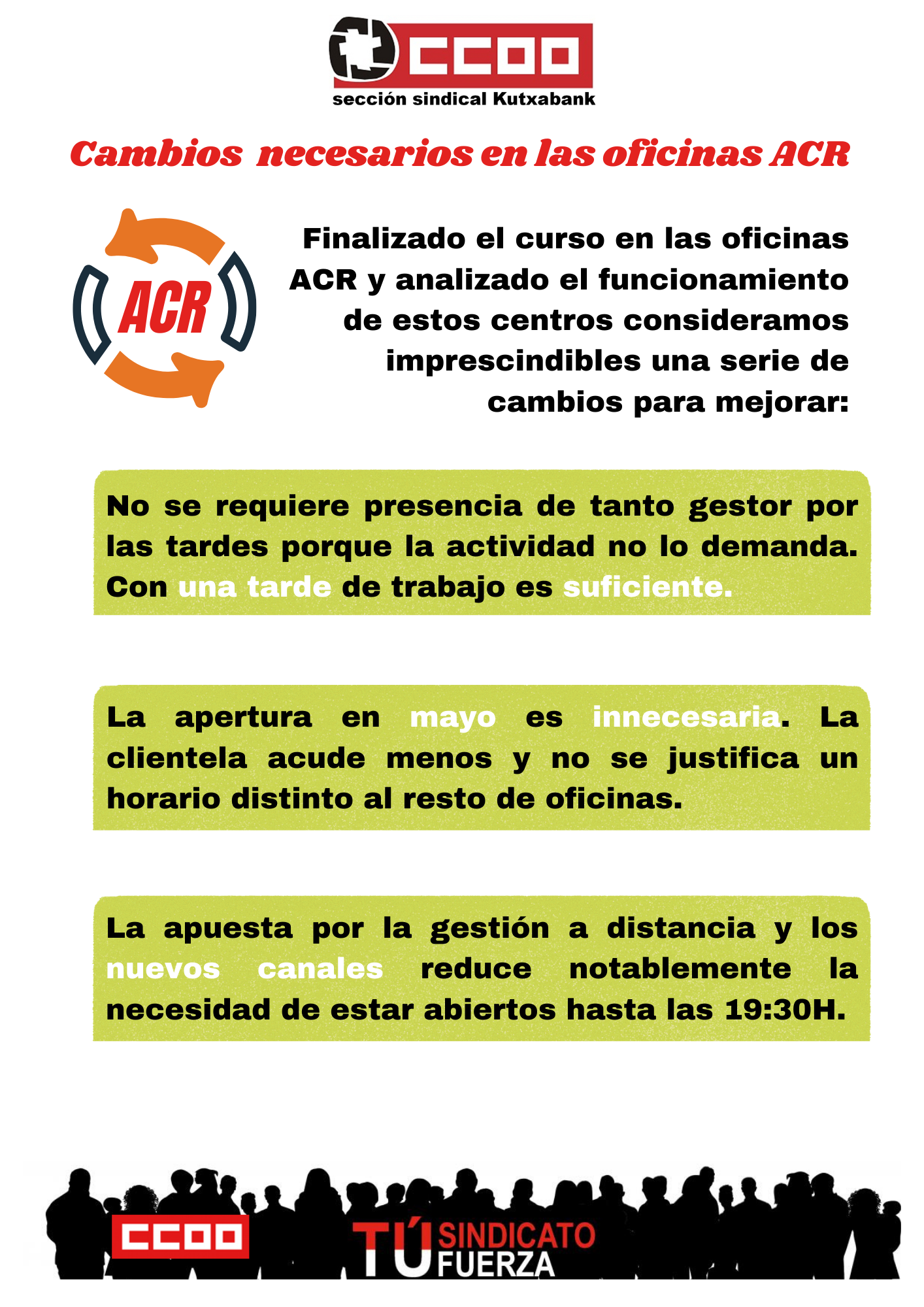 Transcurrido un tiempo y visto el funcionamiento de las oficinas ACR planteamos una serie de modificaciones en estos centros tendentes a reducir el tiempo de apertura y horarios.