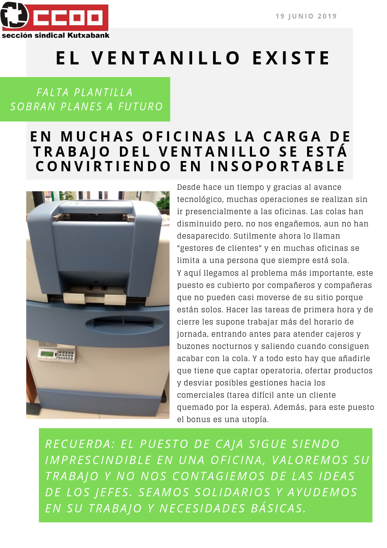 En Kutxabank se reduce el personal del puesto de caja mientras su carga de trabajo va en aumento. Es necesario dignificar esta labor y no olvidarnos que sigue siendo esencial en las oficinas.