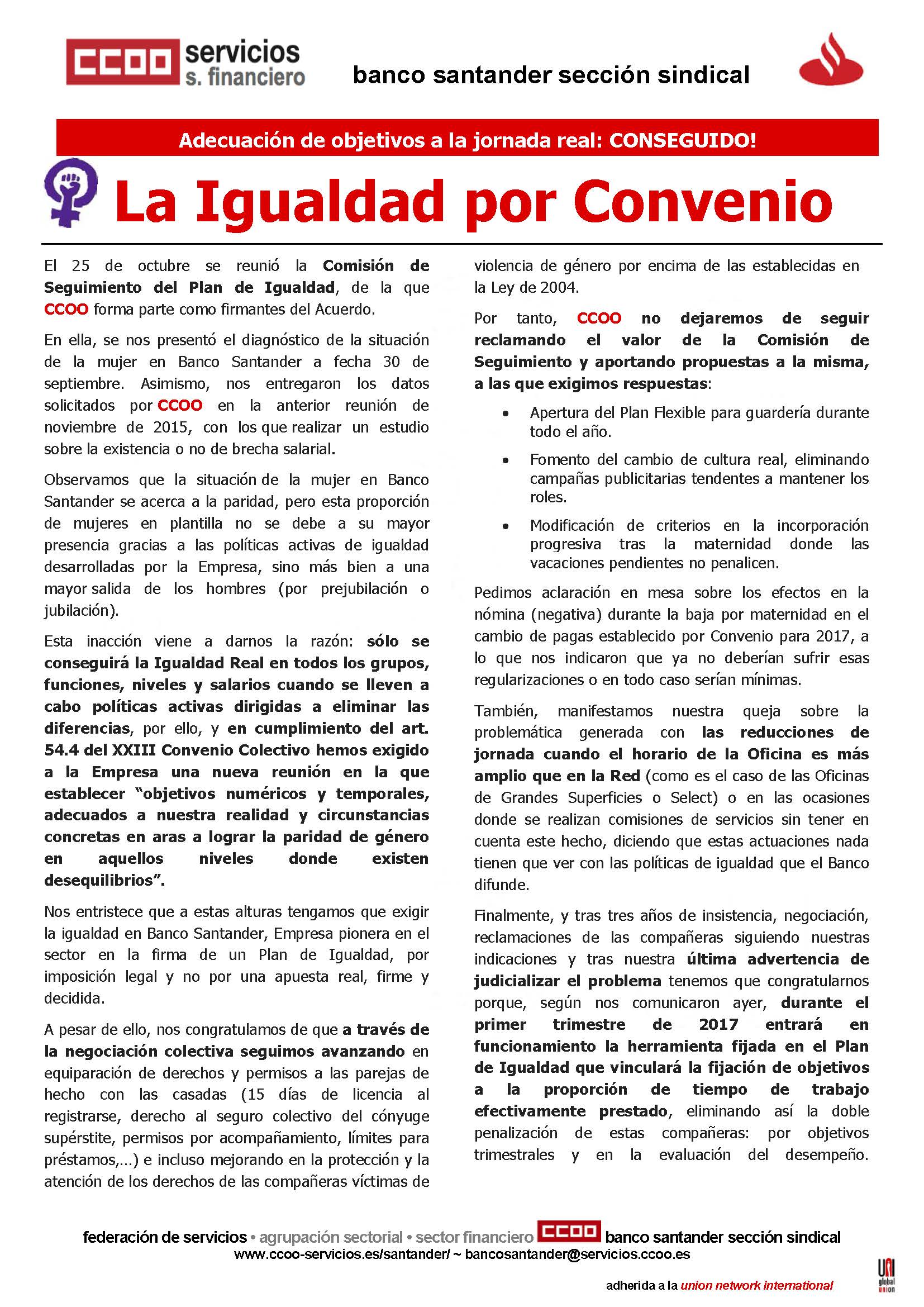CCOO nos entristece que a estas alturas tengamos que exigir la igualdad en Banco Santander, Empresa pionera en el sector en la firma de un Plan de Igualdad, por imposición legal y no por una apuesta real, firme y decidida.