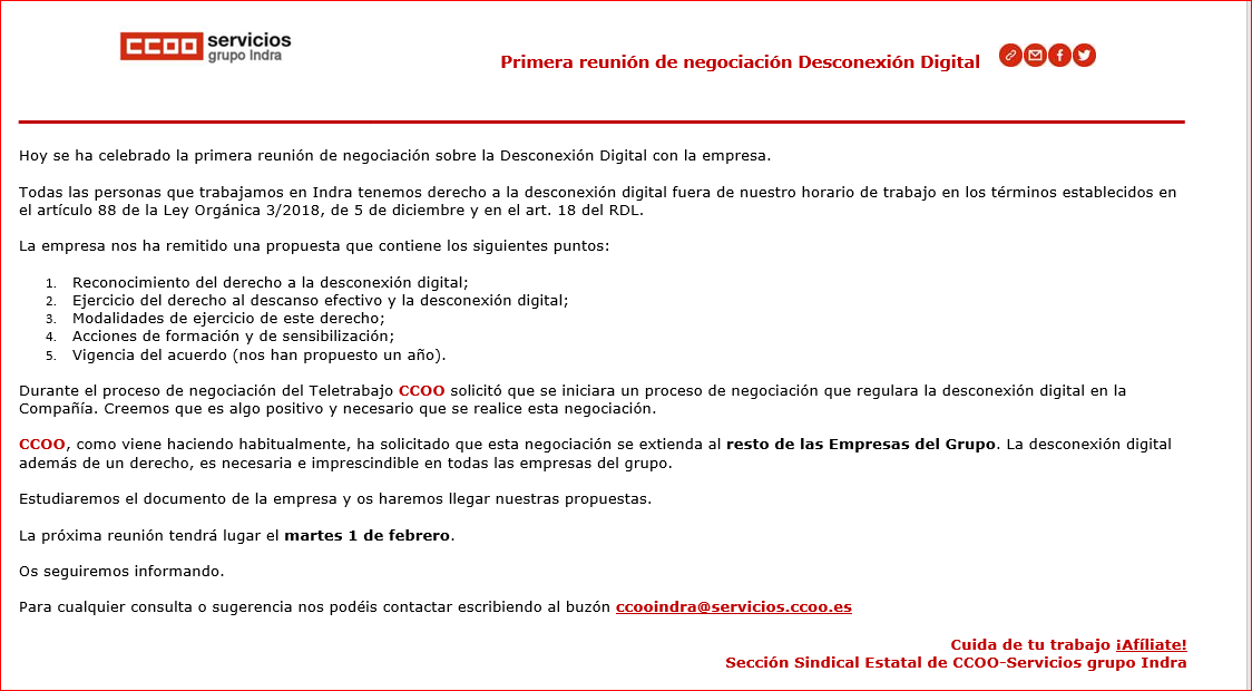 Seguimos trabajando con intensidad para sacar el mejor acuerdo posible de teletrabajo en Oesía. En este sentido, durante estas últimas semanas hemos mantenido dos reuniones más con la Dirección de la empresa y el resto de sindicatos, 29 de diciembre y 7 de enero, y agendado la siguiente reunión para el próximo 12 de enero.