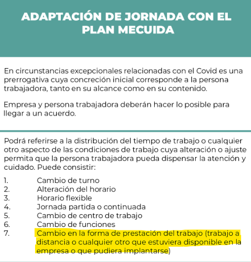 Pero también el día 22 se prorrogó el plan MECUIDA, hasta el 31 de enero de 2021, para facilitar la conciliación… y entre las medidas que nos dijo Atmira que se pueden pedir, como las excedencias o las reducciones de jornada, se mantiene la adaptación de jornada y hasta la forma de prestación del trabajo, siendo válido solicitar el teletrabajo. Desde ya mismo, o cuando Atmira nos pase a fase II, si tienes una necesidad de conciliar con familiares hasta segundo grado de consanguinidad, esta puede ser la fórmula… que, cerrando el círculo, vuelve a ser el teletrabajo. Llegado el caso, estamos a tu disposición para gestionarlo con RRHH, asesorándote y acompañándote en el proceso.