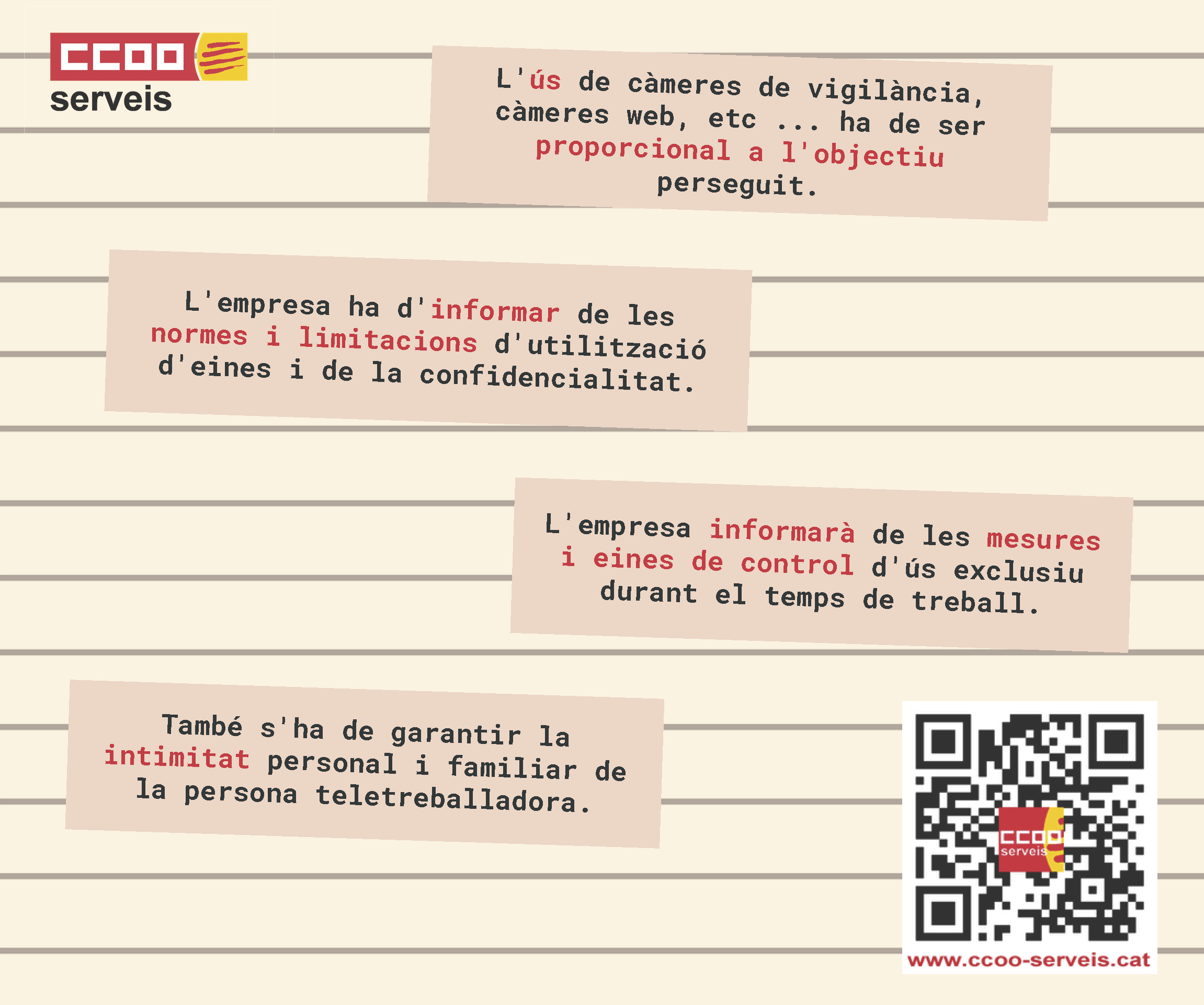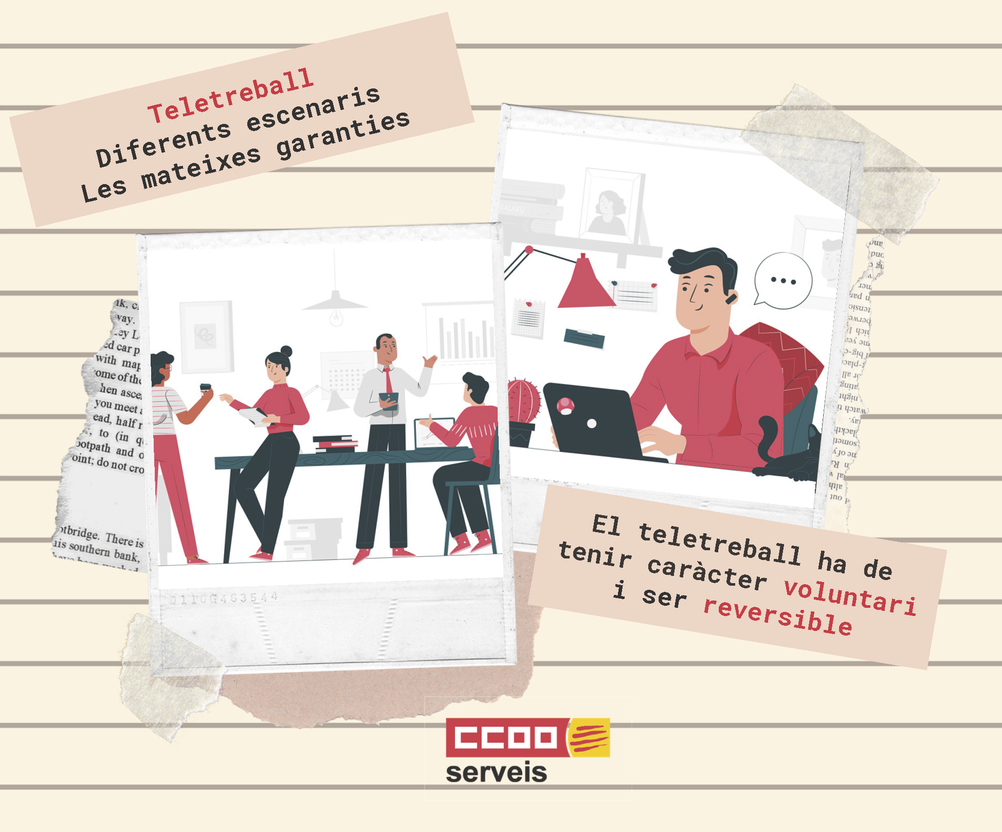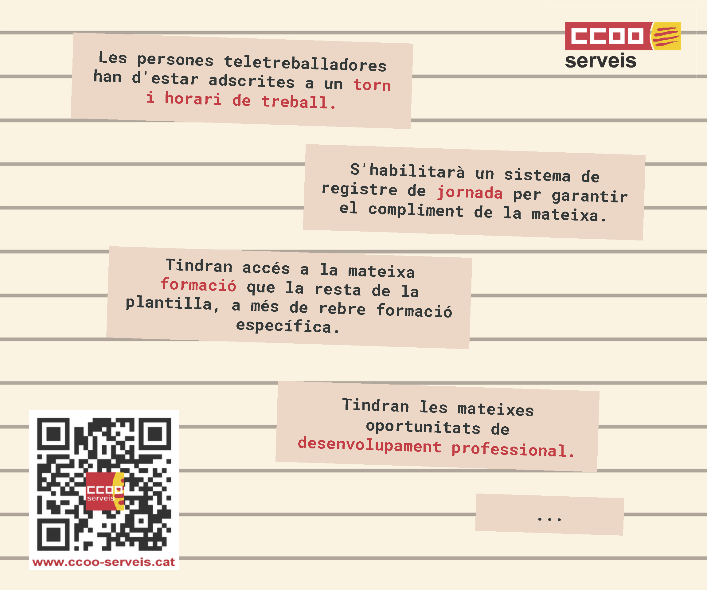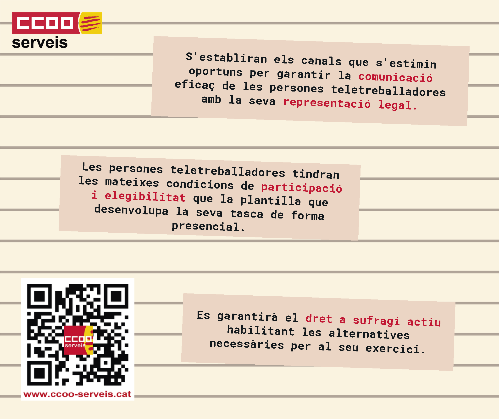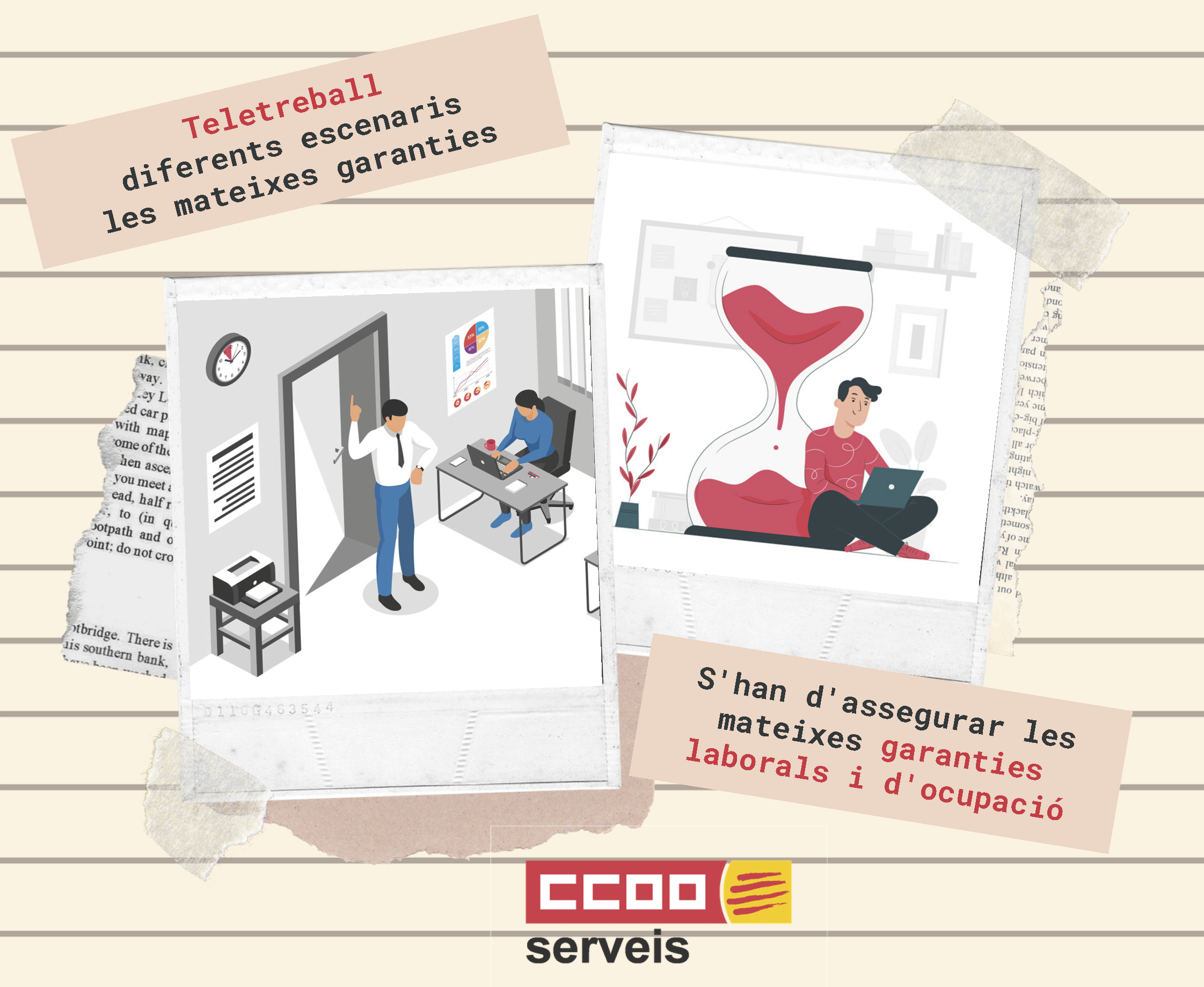2- La persona que teletreballa ha de tenir les mateixes garanties laborals i d'ocupació que si exercís la seva tasca de manera presencial https://www.ccoo-servicios.es/archivos/catalunya/Teletreball2.pdf