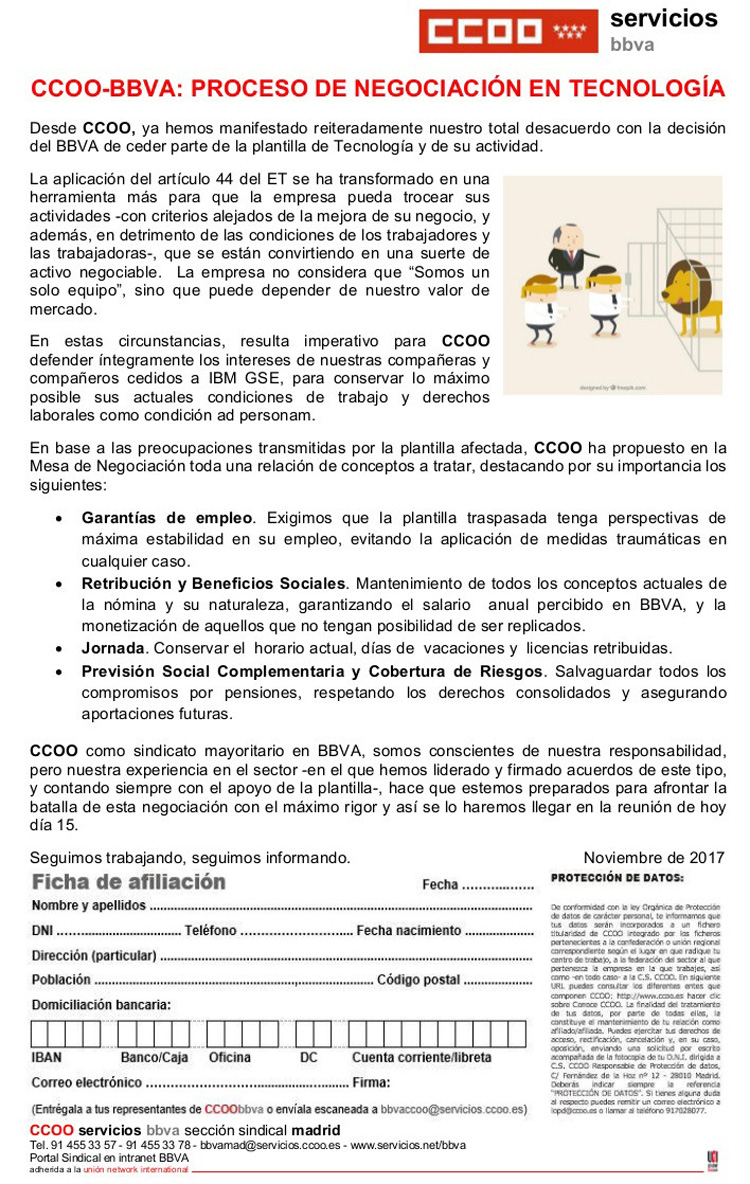 Desde CCOO, ya hemos manifestado reiteradamente nuestro total desacuerdo con la decisión del BBVA de ceder parte de la plantilla de Tecnología y de su actividad.