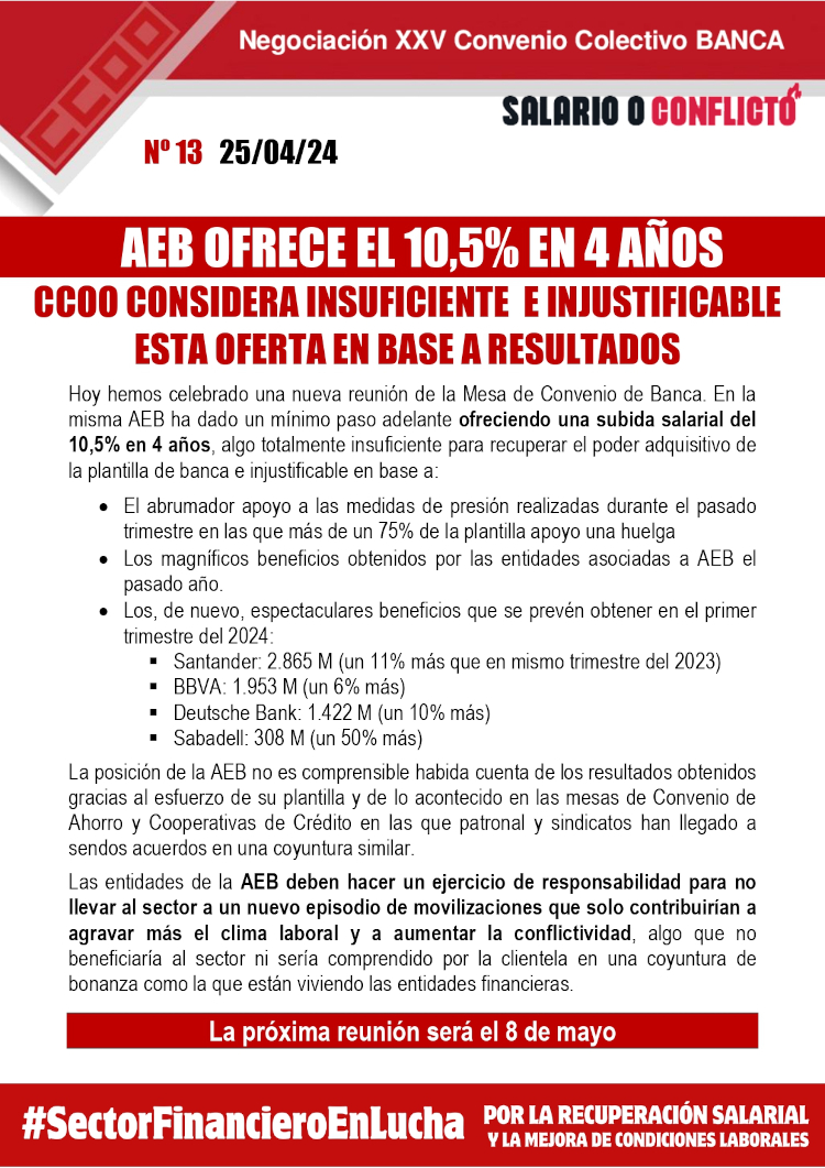 Hoy hemos celebrado una nueva reunión de la Mesa de Convenio de Banca. En la misma AEB ha dado un mínimo paso adelante ofreciendo una subida salarial del 10,5% en 4 años, algo totalmente insuficiente para recuperar el poder adquisitivo de la plantilla de banca e injustificable.