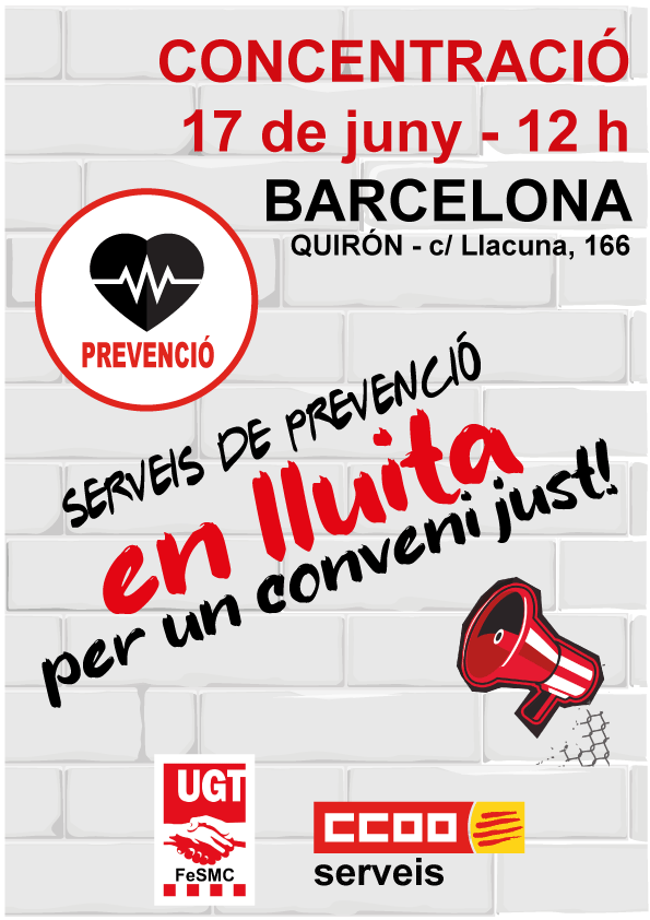 CCOO i UGT inicien actuacions conjuntes davant del bloqueig del Conveni de Serveis de Prevenció. El 17 de juny estan convocades a les 12 hores concentracions a les seus de les principals empreses.