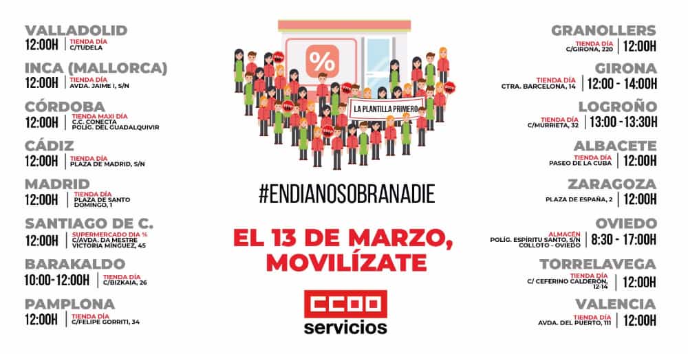 Tras la negativa por parte de la empresa de retirar el ERE y su falta de claridad en cuanto a una posible prórroga del plazo de negociación, CCOO convoca a la plantilla de DIA a movilizarse, con concentraciones en tiendas y almacenes el día 13 y con dos paros parciales el 20 de marzo en todos sus centros de trabajo