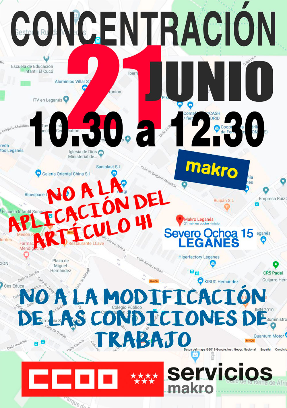 Este viernes, 21 de junio, a las 10,30 horas, tendrá lugar una nueva concentración de delegados y delegadas de CCOO de Makro en Leganés (Severo Ochoa, 15), por la defensa de las condiciones laborales de la plantilla y para protestar por la aplicación del artículo 41 de modificación de las condiciones de trabajo.