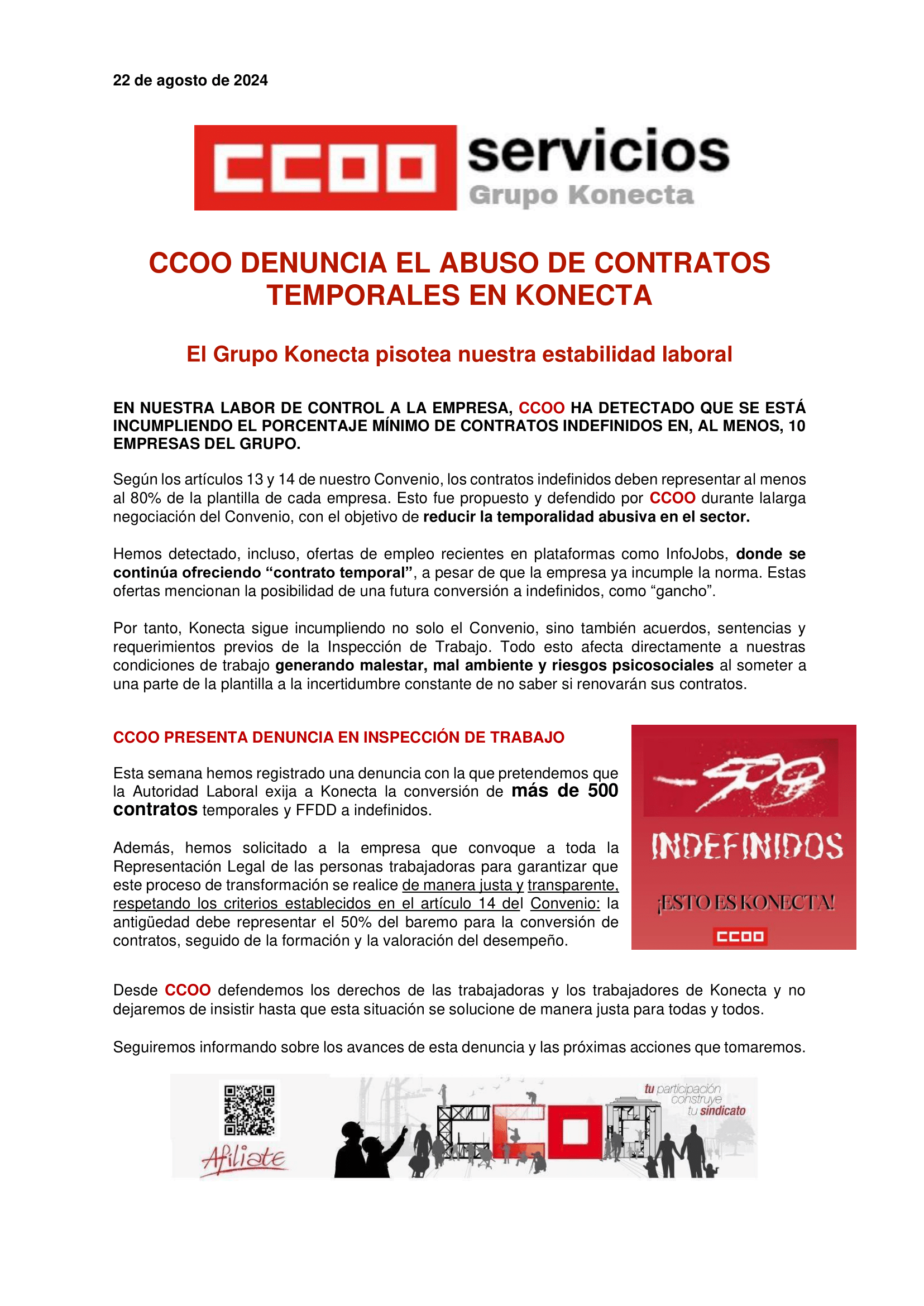 Esta semana hemos registrado una denuncia con la que pretendemos que la Autoridad Laboral exija a Konecta la conversión de más de 500 contratos temporales y FFDD a indefinidos.