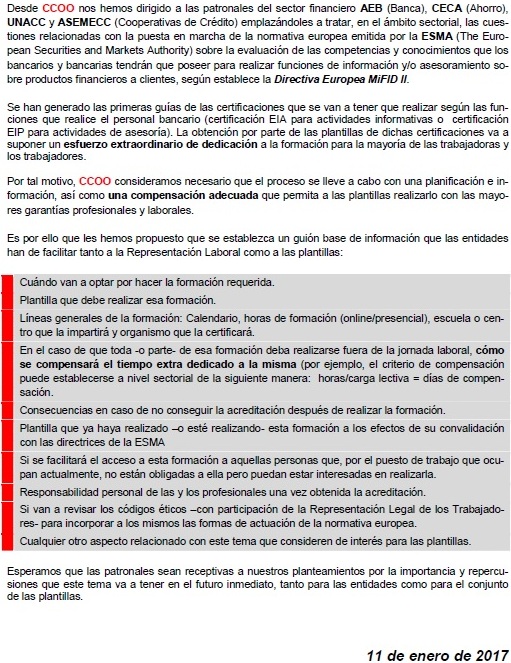 Desde CCOO nos hemos dirigido a las patronales del sector financiero AEB, CECA, UNACC y ASEMECC.. sobre la evolución de las competencias y conocimientos que los bancarios y bancarias tendrán que poseer para realizar funciones de información y/o asesoramiento sobre productos financieros a clientes, según establece la Directiva Europea Mifid II.