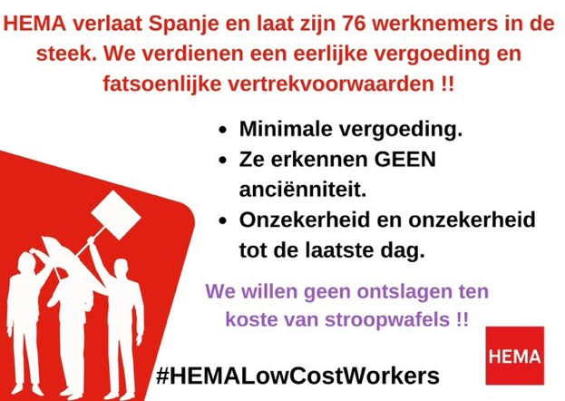 Davant l’ERO que ha presentat HEMA pel tancament de les botigues i l’acomiadament de la totalitat de la seva plantilla, formada per 76 persones treballadores la majoria dones, joves i amb un elevat percentatge del 90 % de jornada parcial, la cadena distribuidora de comerç neederlandesa no mostra cap interès en les negociacions per poder arribar a un acord, per la qual cosa CCOO convoca concentracions davant les seves botigues per denunciar la situació i exigir un canvi d'actitud de la direcció de l'empresa.