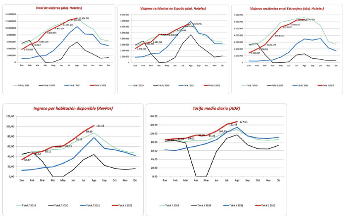 Los datos de coyuntura turística de Enero- Agosto 2022 arrojan cifras de visitantes acumuladas del 92,9% de las arrojadas en dicho periodo en 2019 y del 98,7% en el mes de Agosto. El turismo nacional arroja en dicho periodo cifras equivalentes a las de 2019 (99,5 % de aquellas) y las supera en el mes de agosto en un 1,1%. Y el turismo extranjero consolida su recuperacio?n con unas cifras del 86,6% de las de 2019 en los 8 primeros meses y del 96,3% en el mes de Agosto respecto a Agosto 2019. En definitiva, el sector turístico vuelve a situarse en cifras record, superiores a las pre-pandemia, de forma muy significada en los indicadores de rentabilidad hotelera, que en Agosto 2022 se sitúan por encima de Agosto 2019 en un 116,9% (el RevPar -ingreso por habitación disponible) y en un 116,8% (el ADR- tarifa media diaria).