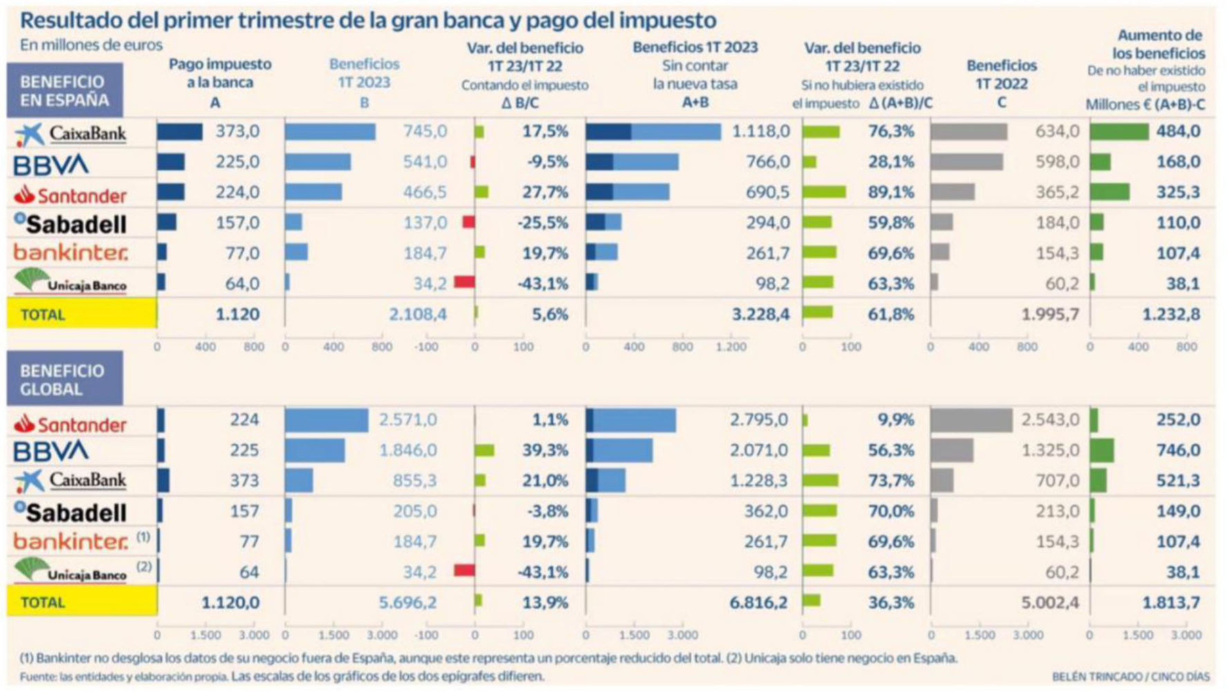 Les entitats financeres de l'IBEX-35 han tancat el primer trimestre del 2023 amb un increment rècord del seu marge d'interessos -que s'incrementa globalment des dels 4.420 als 6.373 milions €- i dels seus beneficis -que sense l'efecte de l'impost especial es dispararien en un 61,8% a nivell de negoci a Espanya i en un 36,3% a nivell global. Cal tenir en compte, a més, que l'impost especial es comptabilitza anticipadament en aquest ltr23, per la qual cosa els propers avenços trimestrals de resultats 2023 ja no es minoraran per l'impost.