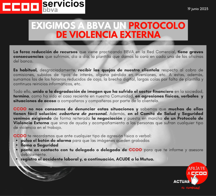 La feroz reducción de recursos que viene practicando BBVA en la Red Comercial, tiene graves consecuencias que sufrimos, día a día, la plantilla que damos la cara en cada una de las oficinas del banco.