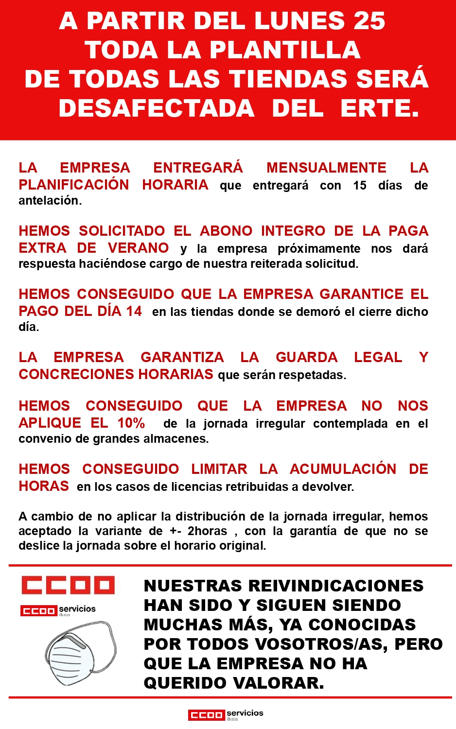 • Hemos conseguido que la empresa no nos aplique el 10% de la jornada irregular contemplada en el convenio de grandes almacenes.