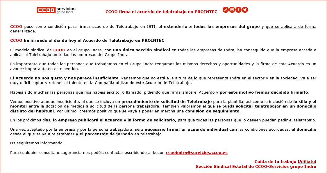 CCOO: firmado el acuerdo de teletrabajo en PROINTEC