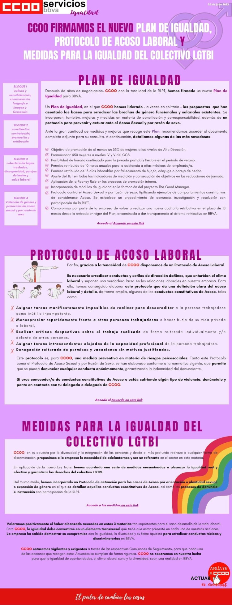 Después de años de negociación, CCOO con la totalidad de la RLPT, hemos firmado un nuevo Plan de Igualdad para BBVA.