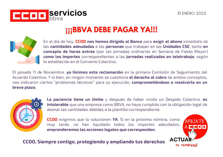 En el día de hoy, CCOO nos hemos dirigido al Banco para exigir el abono inmediato de las cantidades adeudadas a las personas que trabajan en las Unidades CSE, tanto en concepto de horas extras (por las jornadas ordinarias en Semana de Fiesta Mayor) como los importes correspondientes a las jornadas realizadas en teletrabajo, según lo establecido en el Convenio Colectivo.