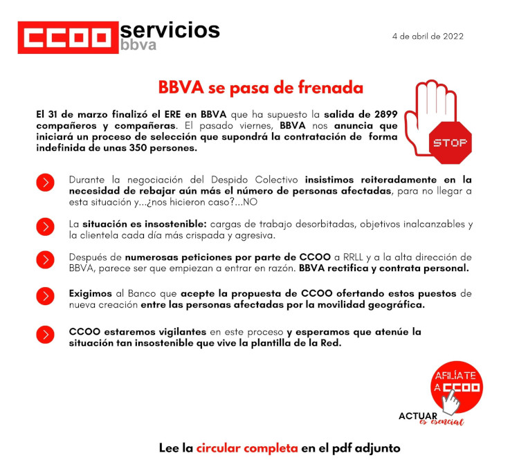 Para CCOO, de alguna manera, BBVA rectifica: Se pasaron de frenada