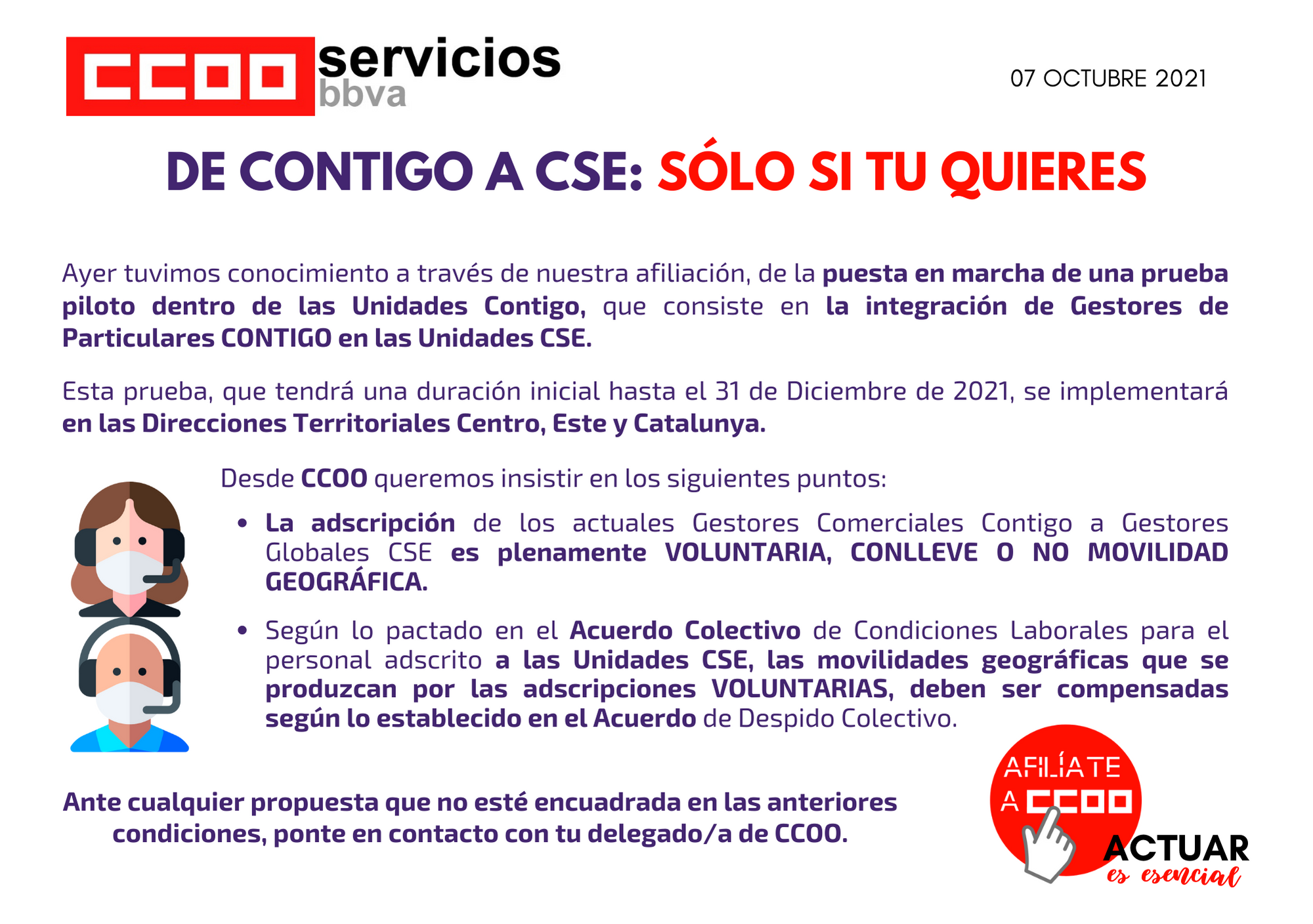 – La adscripción de los actuales Gestores Comerciales Contigo a Gestores Globales CSE es plenamente VOLUNTARIA, CONLLEVE O NO MOVILIDAD GEOGRÁFICA.