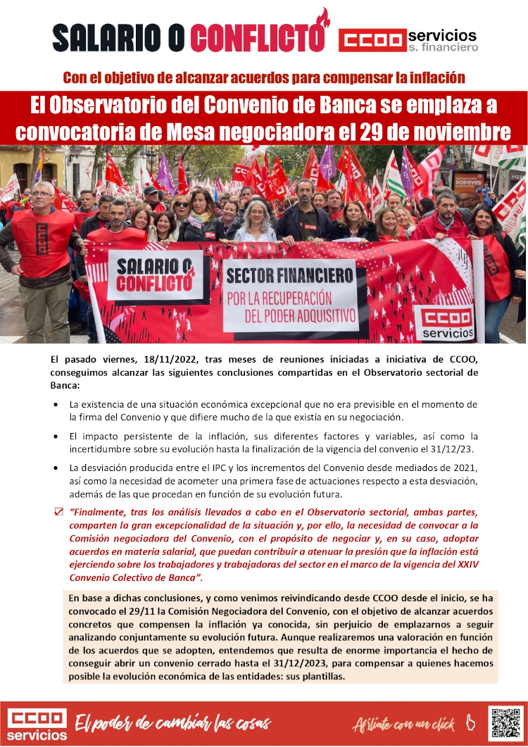 El pasado viernes, 18/11/2022, tras meses de reuniones iniciadas a iniciativa de CCOO, conseguimos alcanzar las siguientes conclusiones compartidas en el Observatorio sectorial de Banca: El Observatorio del Convenio de Banca se emplaza a convocatoria de Mesa negociadora el 29 de noviembre.