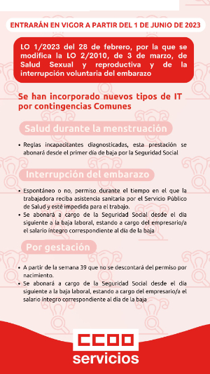 CCOO resume en un comunicado información sobre la ENTRADA EN VIGOR NUEVAS BAJAS a partir de la Ley Orgánica 1/2023, de 28 de febrero, por la que se modifica la Ley Orgánica 2/2010, de 3 de marzo, de salud sexual y reproductiva y de la interrupción voluntaria del embarazo, en su Disposición final tercera establece la modificación del texto refundido de la Ley General de la Seguridad Social, aprobado por el Real Decreto Legislativo 8/2015, de 30 de octubre.