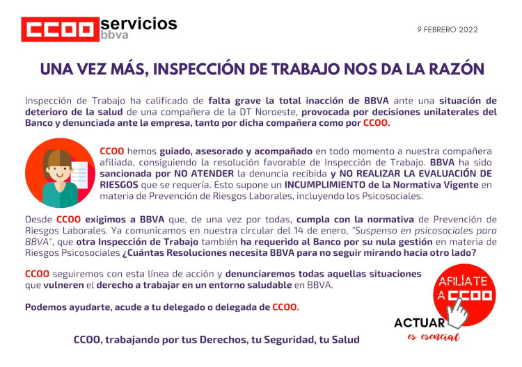 CCOO hemos guiado, asesorado y acompañado en todo momento a nuestra compañera afiliada, consiguiendo la resolución favorable de Inspección de Trabajo. BBVA ha sido sancionada por NO ATENDER la denuncia recibida y NO REALIZAR LA EVALUACIÓN DE RIESGOS que se requería. Esto supone un INCUMPLIMIENTO de la Normativa Vigente en materia de Prevención de Riesgos Laborales, incluyendo los Psicosociales.