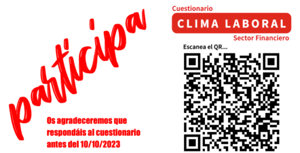 Ante esta situación, con el fin de generar un análisis sectorial completo, no solo empresa a empresa, desde la Federación Estatal de Servicios de CCOO lanzamos este CUESTIONARIO SOBRE CLIMA LABORAL, para que los trabajadores y trabajadoras del sector financiero podáis expresaros, aportándonos más argumentos para denunciar públicamente y exigir soluciones en los marcos sectoriales, reivindicando un modelo laboral sostenible.