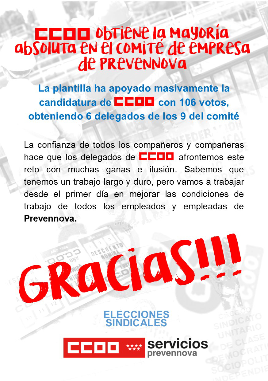 La confianza de todos los compañeros y compañeras hace que los delegados de CCOO afrontemos este reto con muchas ganas e ilusión. Sabemos que tenemos un trabajo largo y duro, pero vamos a trabajar desde el primer día en mejorar las condiciones de trabajo de todos los empleados y empleadas de Prevennova.