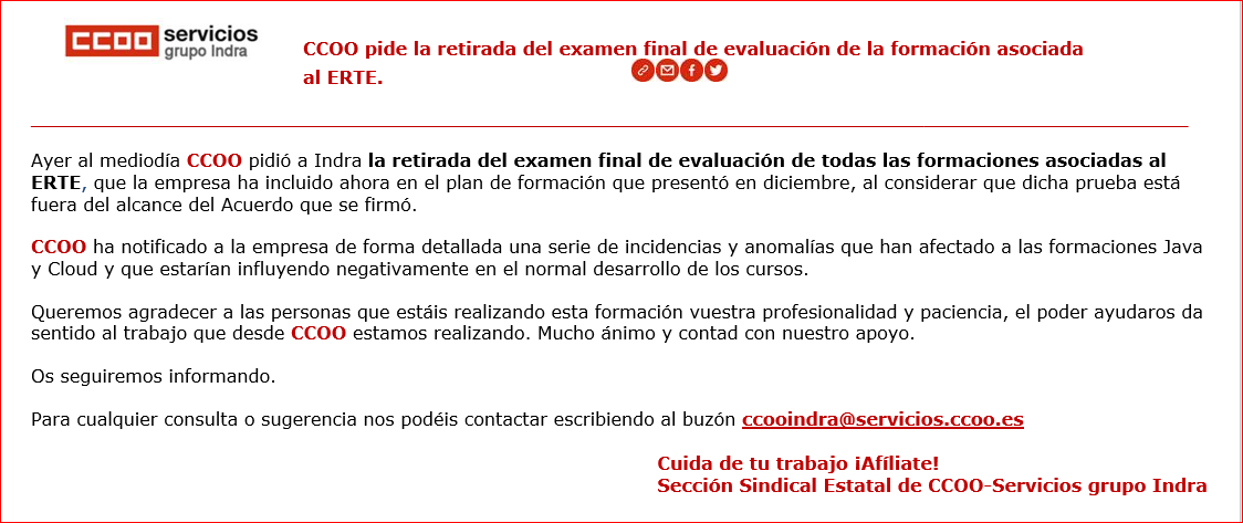 CCOO pide la retirada del examen final evaluación de la formación asociada al ERTE.