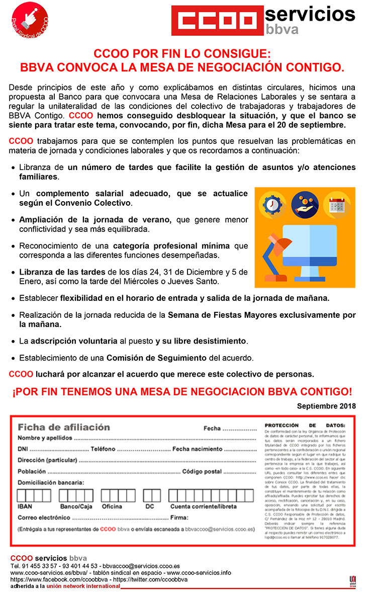 de BBVA Contigo. CCOO hemos conseguido desbloquear la situación, y que el banco se siente para tratar este