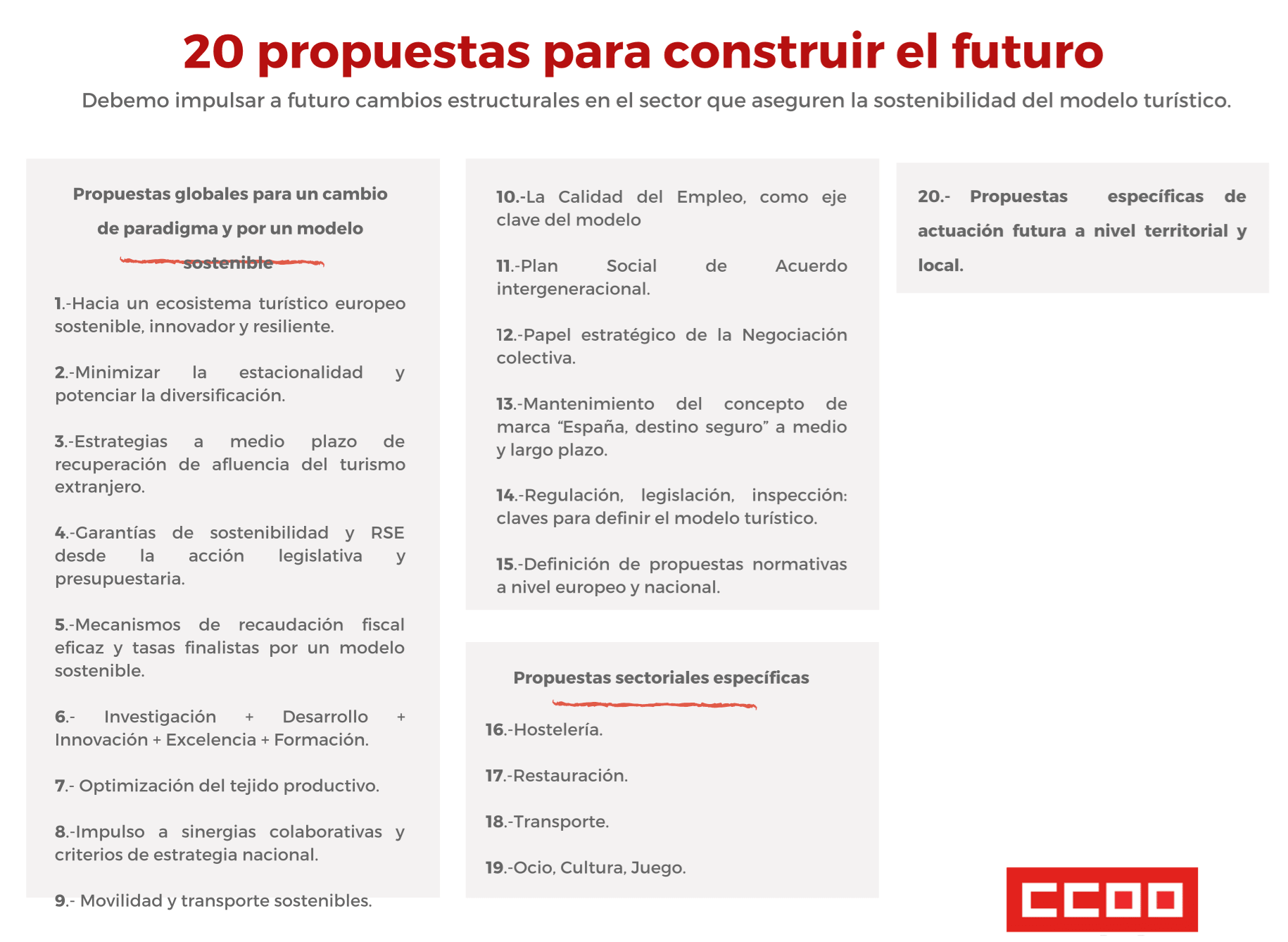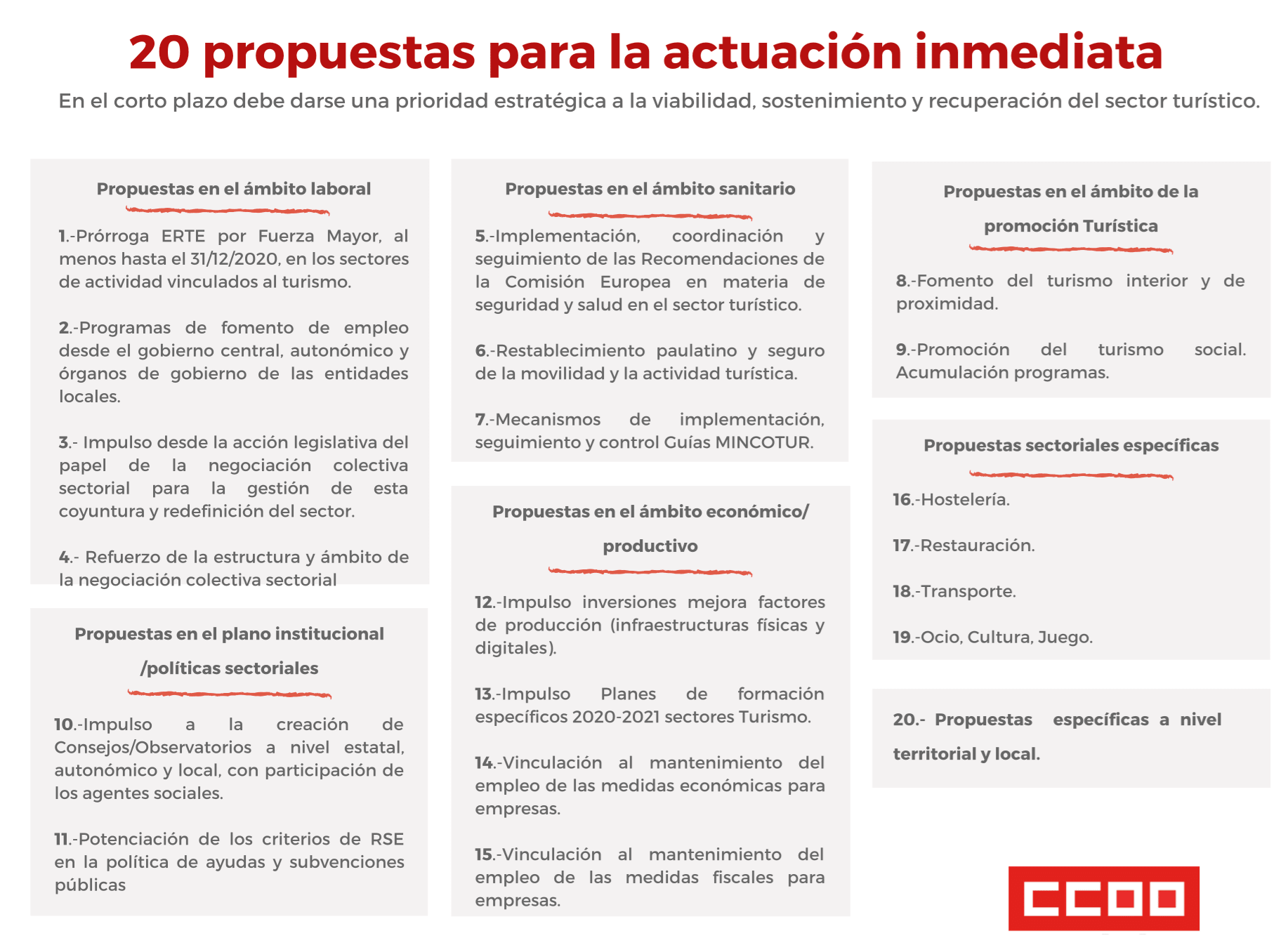 20 propuestas  para dar respuesta a lo inmediato y urgente, para impulsar la reactivación de  todos los sectores turísticos y, garantizar la seguridad de las personas ? residentes, turistas y trabajadoras- a través del cumplimiento de los protocolos sanitarios, asegurar la continuidad y liquidez del tejido empresarial, de forma condicionada al mantenimiento del empleo a través de fórmulas no extintivas.